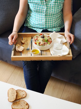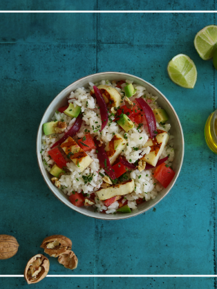 Salade de riz à l’halloumi, avocats et tomates confites