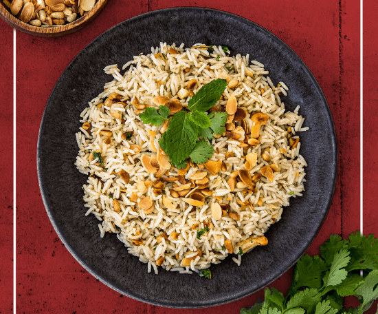 Ajouter les pignons et les amandes effilées à la fin de la cuisson. Saupoudrer de coriandre hachée finement. Verser un filet d’huile d’olive.