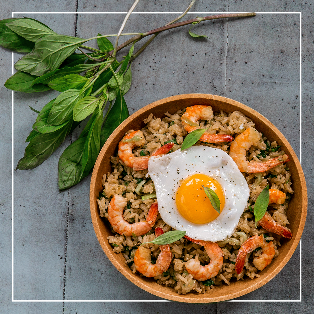 Servir le riz avec un œuf au plat, de la coriandre et du basilic thaï ciselé.
