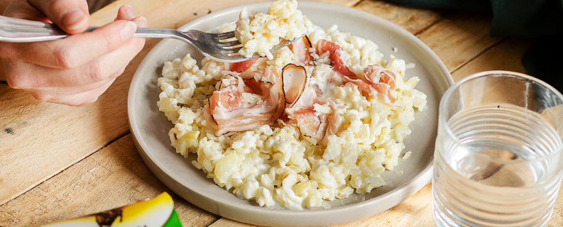 Lorsque le riz est cuit, retirez du feu et ajoutez le parmesan râpé et une dernière louche de bouillon. Poivrez légèrement et mélangez. Servez puis déposez les tranches de pancetta.
