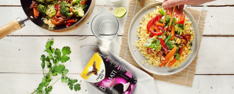 Ajoutez à la place le riz avec l’huile restantes et faites le frire sur feu vif pendant 5 minutes en mélangeant régulièrement. Ajoutez les légumes, mélangez et servez.