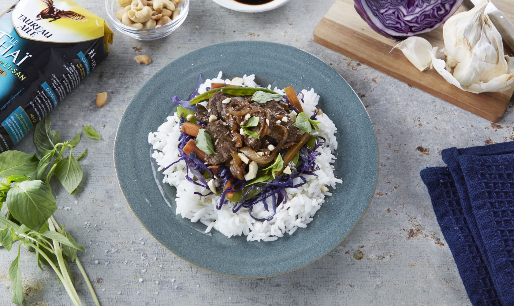 Répartissez le riz chaud dans les assiettes. Garnir chaque portion de mélange au bœuf, de préparation aux légumes, de noix de cajou et de feuilles de basilic thaï, c’est prêt !